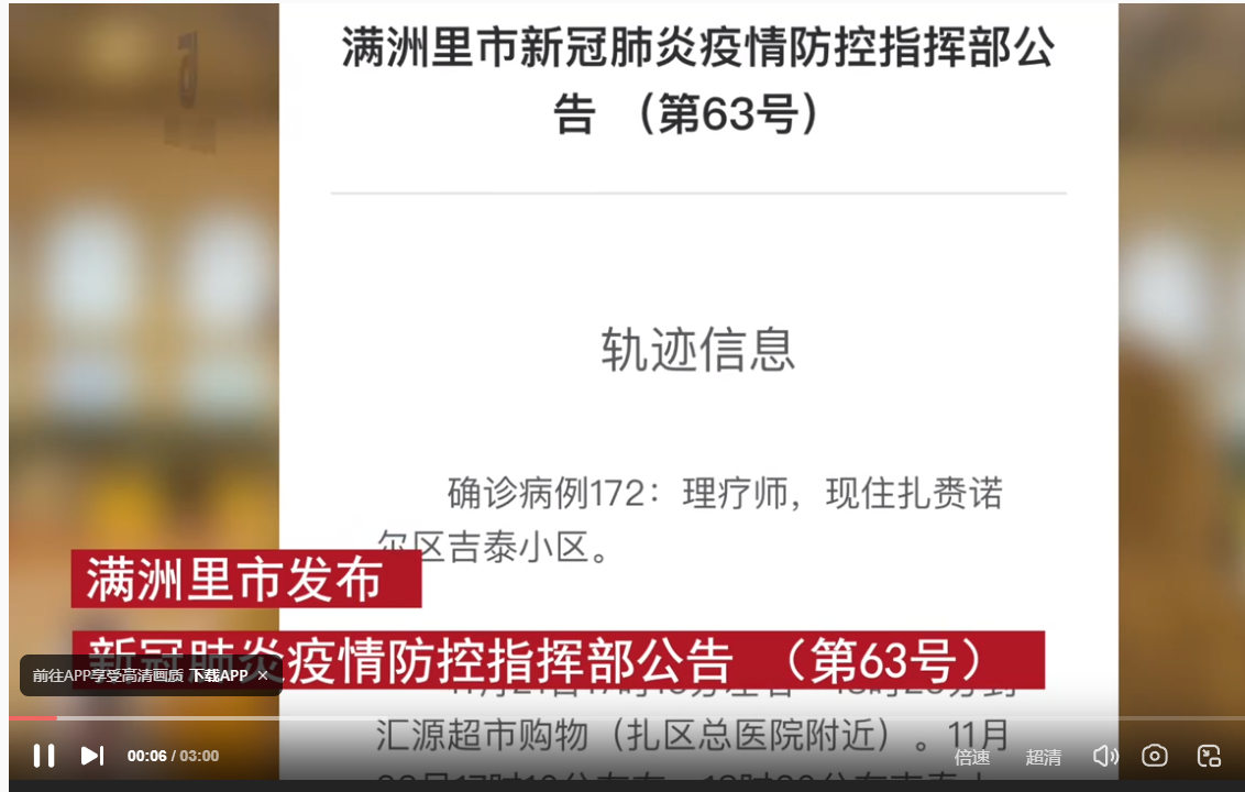 确诊病例181:个体,现住满洲里市道南邮政家属楼。
